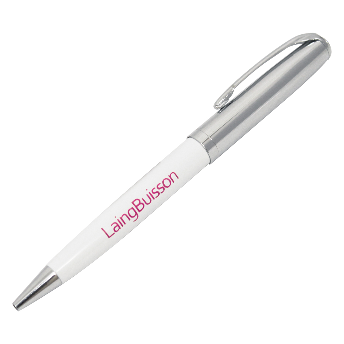 Gloss lacquered body with white chunky barrel and shiny silver metal upper body,clip and pen tip. Twist action mechanism. Parker style black ink refill. Can be laser engraved or printed.