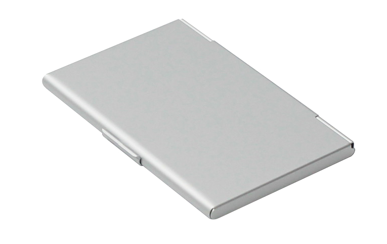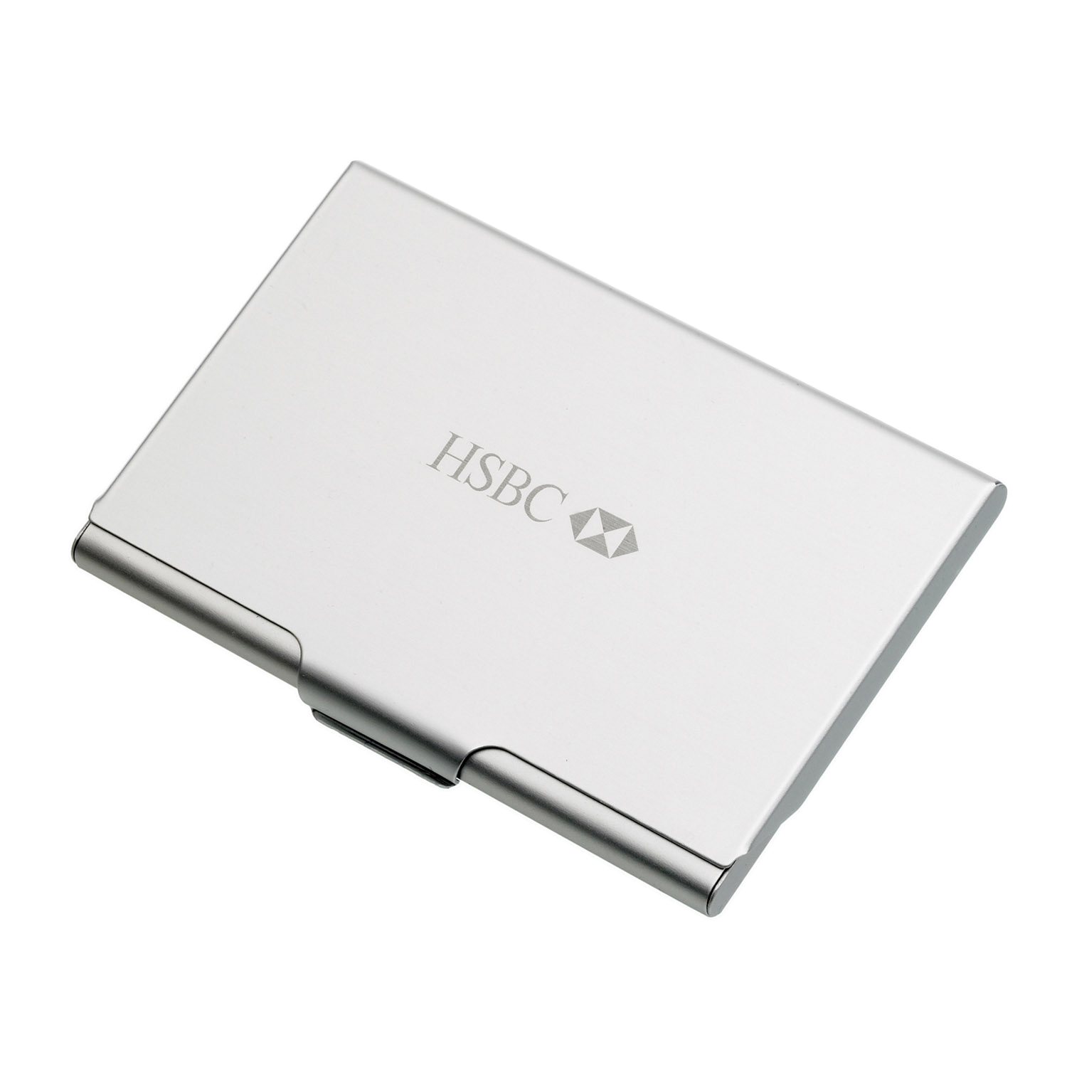 Slimline very lightweight metal business card holder in a matt silver finish all over outer and inner. Secure clip closure. Comfortably holds 10 business cards. Engraving finish is a shade darker than metal finish.
