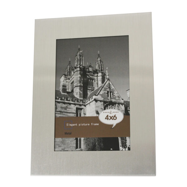 Brushed aluminium lightweight frame in a silver finish with large 30mm border. Holds a 4″ x 6″ photo. Strong secure plastic easel stand and optional wall slots for portrait or landscape stance. Available in 5 x 7″ size too. Can be engraved portrait or landscape.