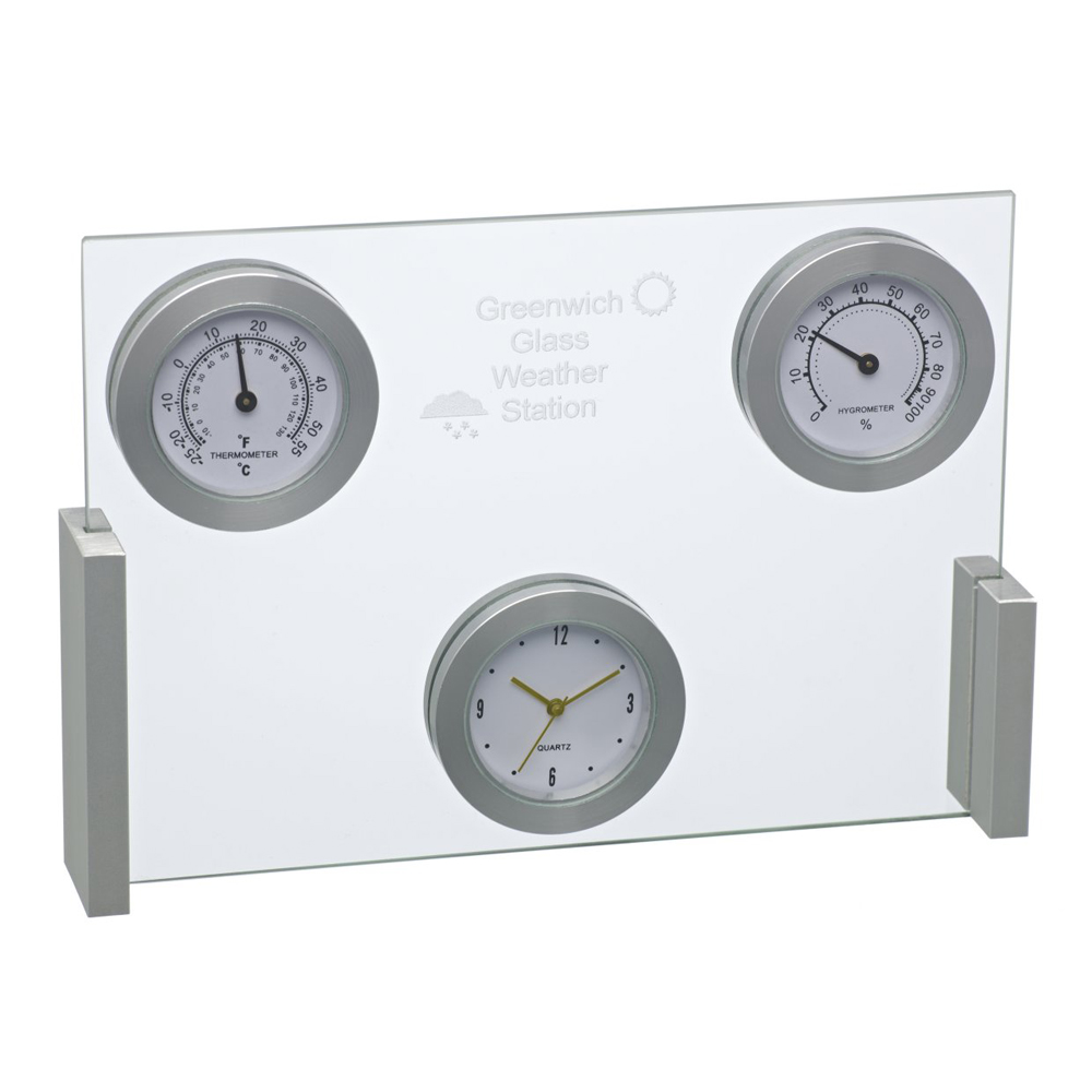 A prominent large glass piece with aluminium trim and stands housing in the centre an analogue clock, thermometer and hygrometer each with an aluminium wide circular frame.