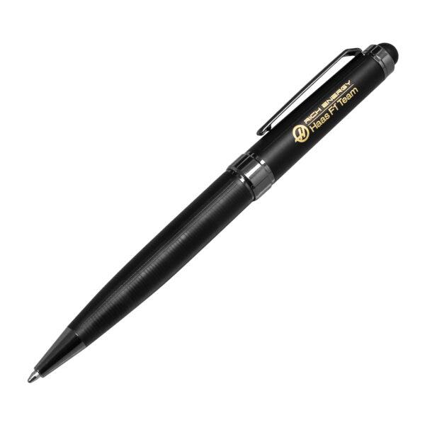 Twist action stylus ballpen with elegant textured black barrel and gunmetal nib, clip and middle trim. The upper section has a smooth panel running adjacent to the stylus above the clip for high impact engraving. Parker style black ink refill as standard.