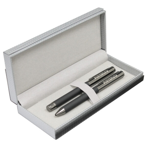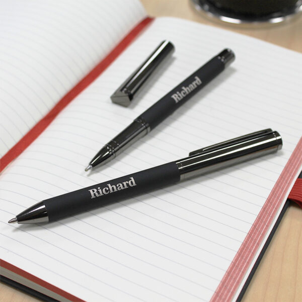 Matching ballpen and rollerball with soft black rubber slender barrel and contrasting polished gunmetal metal detail. Parker style black ink refill as standard. Presented as standard in a hinged lidded box. We can now also offer a box that can be engraved to the lid as an alternative.