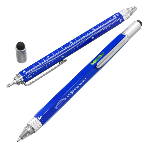6 sided barrel housing 9 useful functions. Ballpen at one end and touch screen stylus the other with a small phillips & flat head screwdriver hidden beneath. Simply twist to reveal and switch. On the barrel is a spirit level and 4 metric rules. Metal Cross style mini refill with black ink.