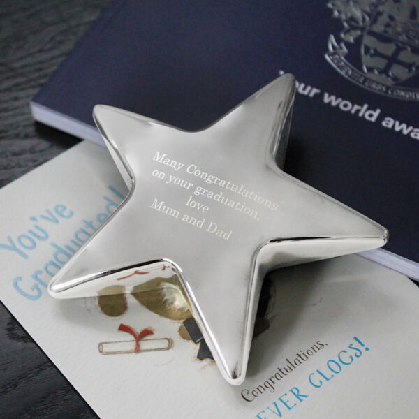 Heavyweight all metal 5 Prong Star with black felt base to protect surfaces. Finished in a brilliant shiny silver with an all over pure clean design to allow maximum impact engraving area. Ideal for individual personalisation. As standard supplied in a tuck box. Gift box with inner foam available as optional extra.